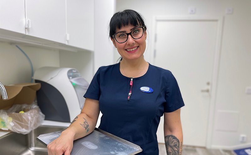 – Jag har fått kämpa lite eftersom jag är ny i Sverige, och jag har inte bäst svenska i klassen. Men jag fokuserar inte på det negativa. Om vi har en turkisk patient här på kliniken så översätter jag. Och jag pratar bra engelska vilket behövs ibland. Jag jobbar alltså trespråkigt och ser det som en resurs.